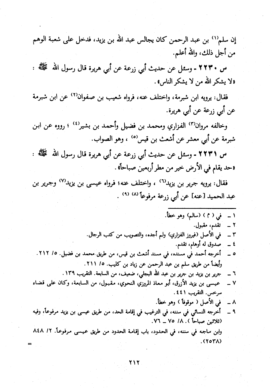 2230- وَسُئِلَ عَنْ حَدِيثِ أَبِي زُرْعَةَ، عَنْ أَبِي هريرة، قال رسول الله صلى الله عليه وَسَلَّمَ: لَا يَشْكُرُ اللَّهَ مَنْ لَا يَشْكُرُ النَّاسَ.