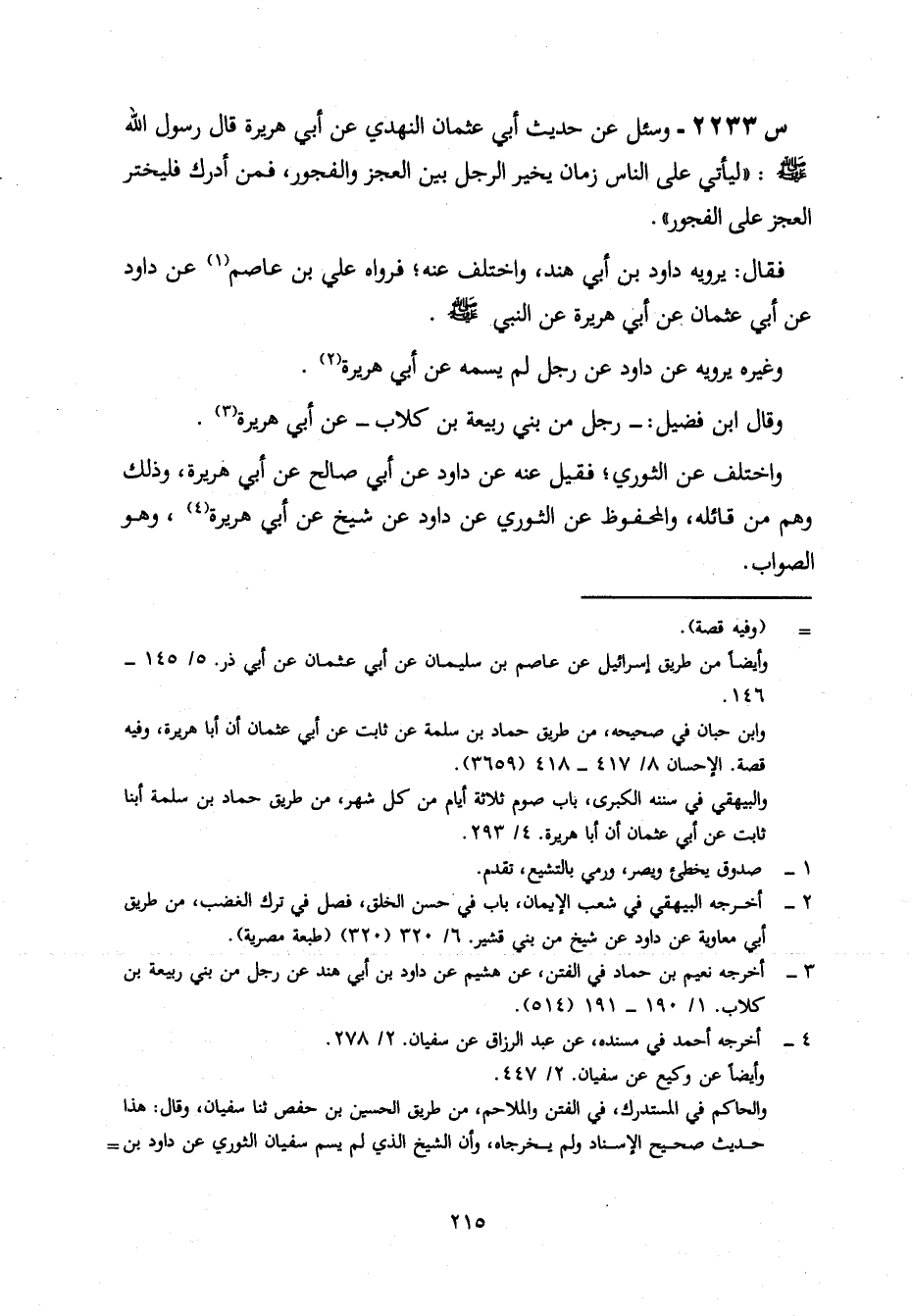 2233- وَسُئِلَ عَنْ حَدِيثِ أَبِي عُثْمَانَ النَّهْدِيِّ، عَنْ أبي هريرة، قال رسول الله صلى الله عَلَيْهِ وَسَلَّمَ: لَيَأْتِي عَلَى النَّاسِ زَمَانٌ يُخَيَّرُ الرَّجُلُ بَيْنَ الْعَجْزِ وَالْفُجُورِ، فَمَنْ أَدْرَكَ فَلْيَخْتَرِ الْعَجَزَ عَلَى الفْجُوُرِ.