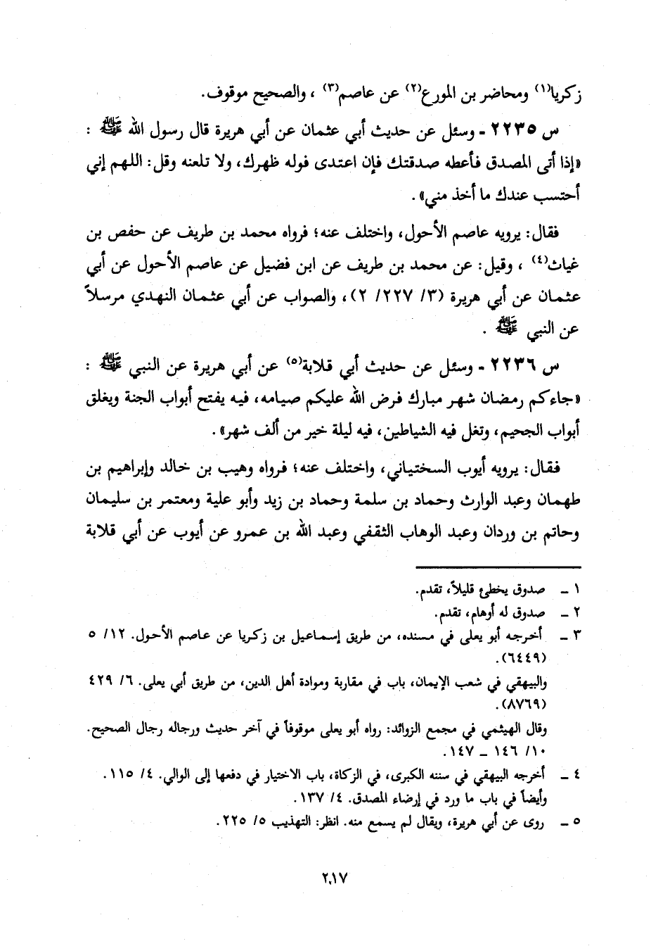 2235- وَسُئِلَ عَنْ حَدِيثِ أَبِي عُثْمَانَ، عَنْ أَبِي هريرة، قال رسول الله صلى الله عليه وَسَلَّمَ: إِذَا أَتَى الْمُصَدِّقُ فَأَعْطِهِ صَدَقَتَكَ، فَإِنِ اعْتَدَى فَوَلِّهِ ظَهْرَكَ، وَلَا تَلْعَنْهُ، وَقُلْ: اللَّهُمَّ إِنِّي أَحْتَسِبُ عِنْدَكَ مَا أَخَذَ مِنِّي.