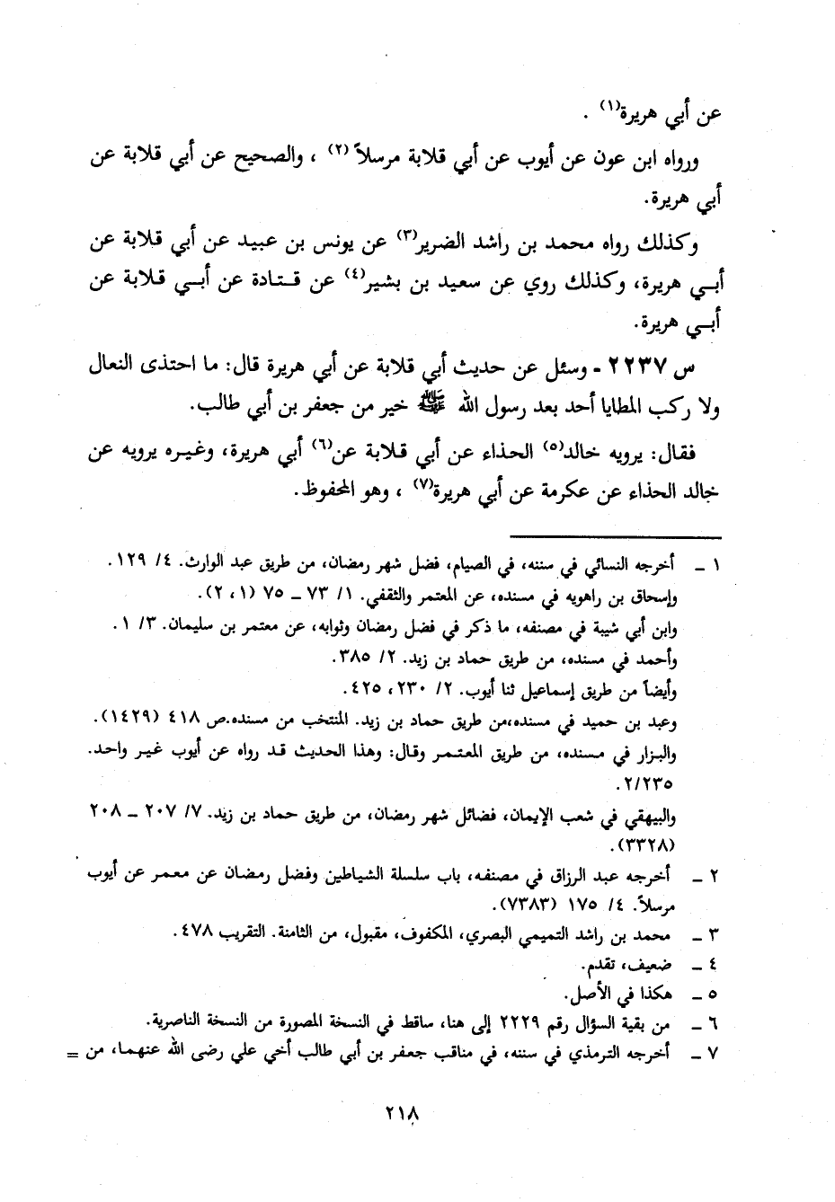 2237- وَسُئِلَ عَنْ حَدِيثِ أَبِي قِلَابَةَ، عَنْ أَبِي هُرَيْرَةَ قَالَ: مَا احْتَذَى النِّعَالَ وَلَا رَكِبَ الْمَطَايَا أَحَدٌ بَعْدَ رَسُولِ اللَّهِ صَلَّى اللَّهُ عَلَيْهِ وَسَلَّمَ خَيْرٌ مِنْ جَعْفَرِ بْنِ أَبِي طَالِبٍ.
