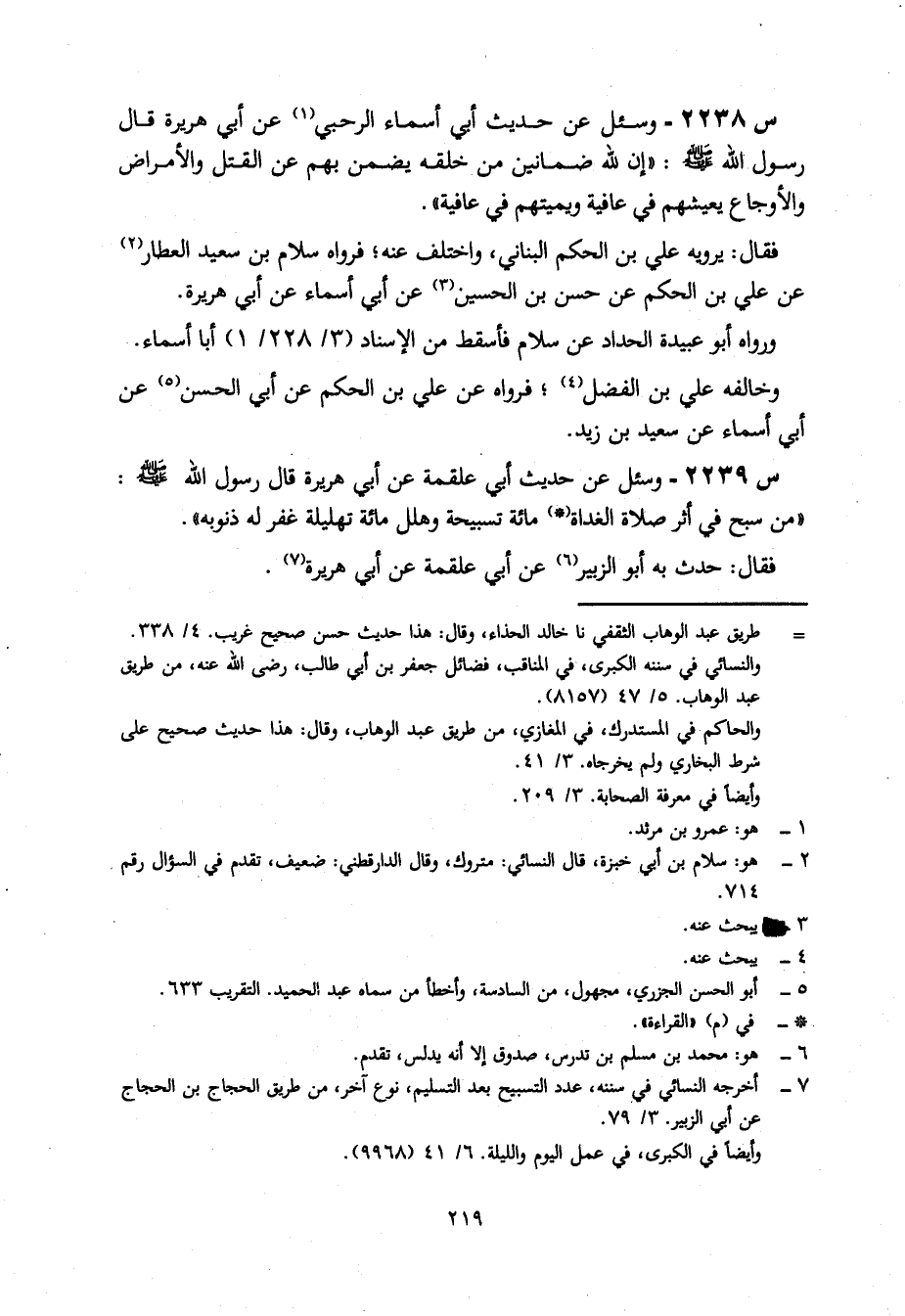 2239- وَسُئِلَ عَنْ حَدِيثِ أَبِي عَلْقَمَةَ، عَنْ أَبِي هريرة، قال رسول الله صلى الله عليه وَسَلَّمَ: مَنْ سَبَّحَ فِي أَثَرِ صَلَاةِ الْغَدَاةِ مئة تسبيحة، وهلل مئة تَهْلِيلَةٍ غُفِرَ لَهُ ذُنُوبُهُ.