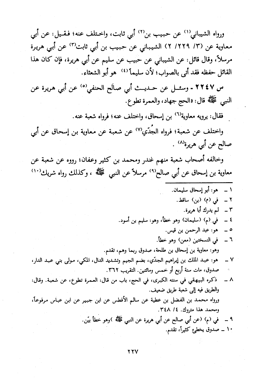 2247- وَسُئِلَ عَنْ حَدِيثِ أَبِي صَالِحٍ الْحَنَفِيِّ، عَنْ أبي هريرة، عن النبي صلى الله عَلَيْهِ وَسَلَّمَ، قَالَ: الْحَجُّ جِهَادٌ، وَالْعُمْرَةُ تَطَوُّعٌ.