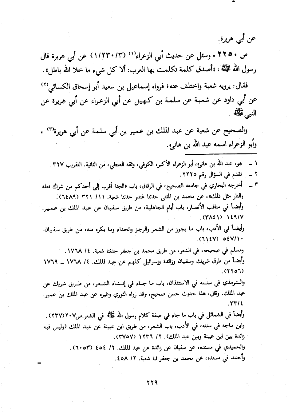 2250- وَسُئِلَ عَنْ حَدِيثِ أَبِي الزَّعْرَاءِ، عَنْ أَبِي هريرة، قال رسول الله صلى الله عليه وَسَلَّمَ: أَصْدَقُ كَلِمَةٍ تَكَلَّمَتْ بِهَا الْعَرَبُ: أَلَا كُلُّ شَيْءٍ مَا خَلَا اللَّهُ بَاطِلٌ.