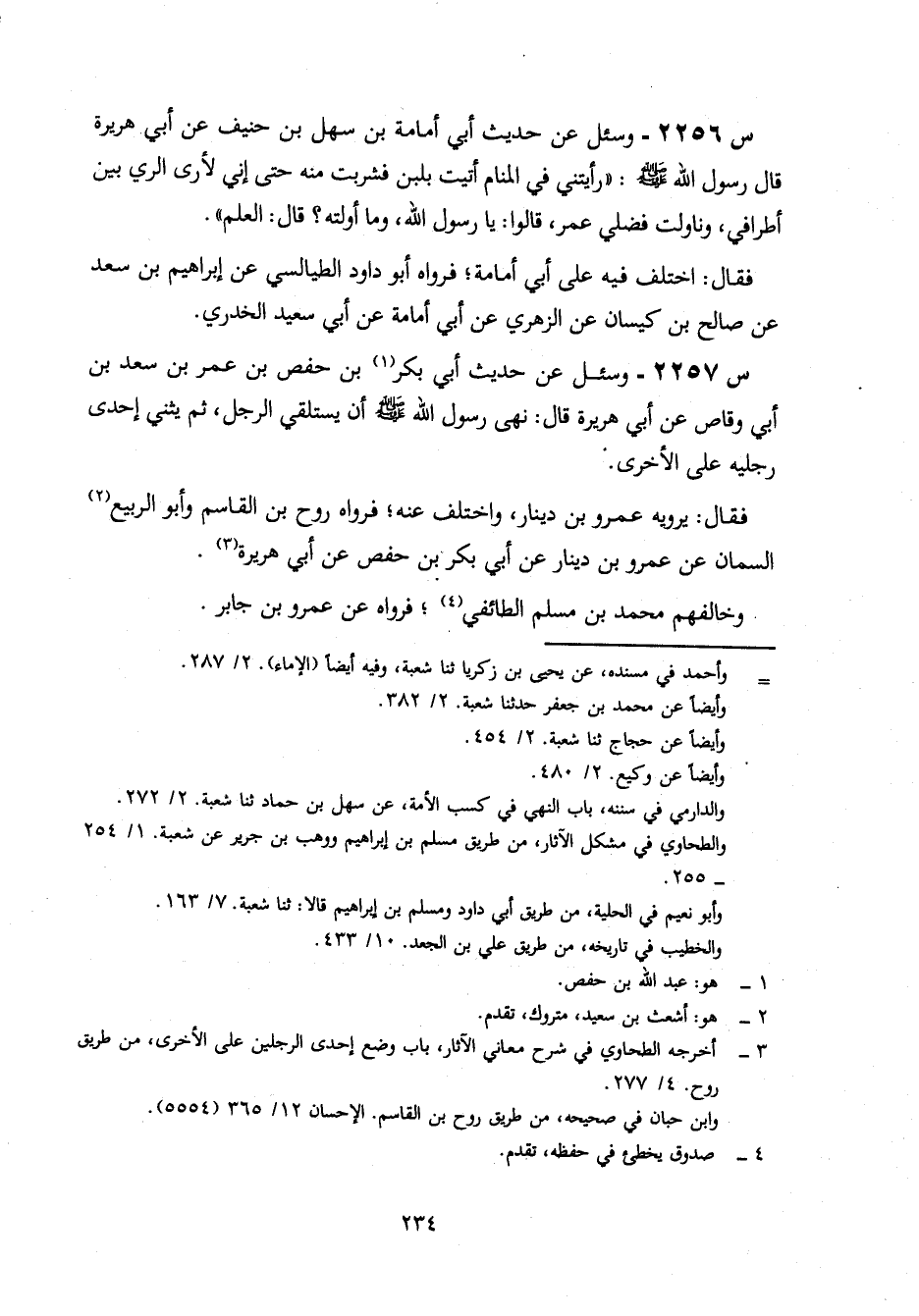2256- وَسُئِلَ عَنْ حَدِيثِ أَبِي أُمَامَةَ بْنِ سَهْلِ بْنِ حَنِيفٍ، عَنْ أَبِي هُرَيْرَةَ، قَالَ رَسُولُ اللَّهِ صَلَّى اللَّهُ عَلَيْهِ وَسَلَّمَ: رَأَيْتُنِي فِي الْمَنَامِ أُتِيتُ بِلَبَنٍ فَشَرِبْتُ مِنْهُ حَتَّى إِنِّي لَأَرَى الرِّيَّ بَيْنَ أَطْرَافِي، وَنَاوَلْتُ فَضْلِي عُمَرَ، قَالُوا: يَا رَسُولَ اللَّهِ، وَمَا أَوَّلْتَهُ؟ قَالَ: الْعِلْمُ.
