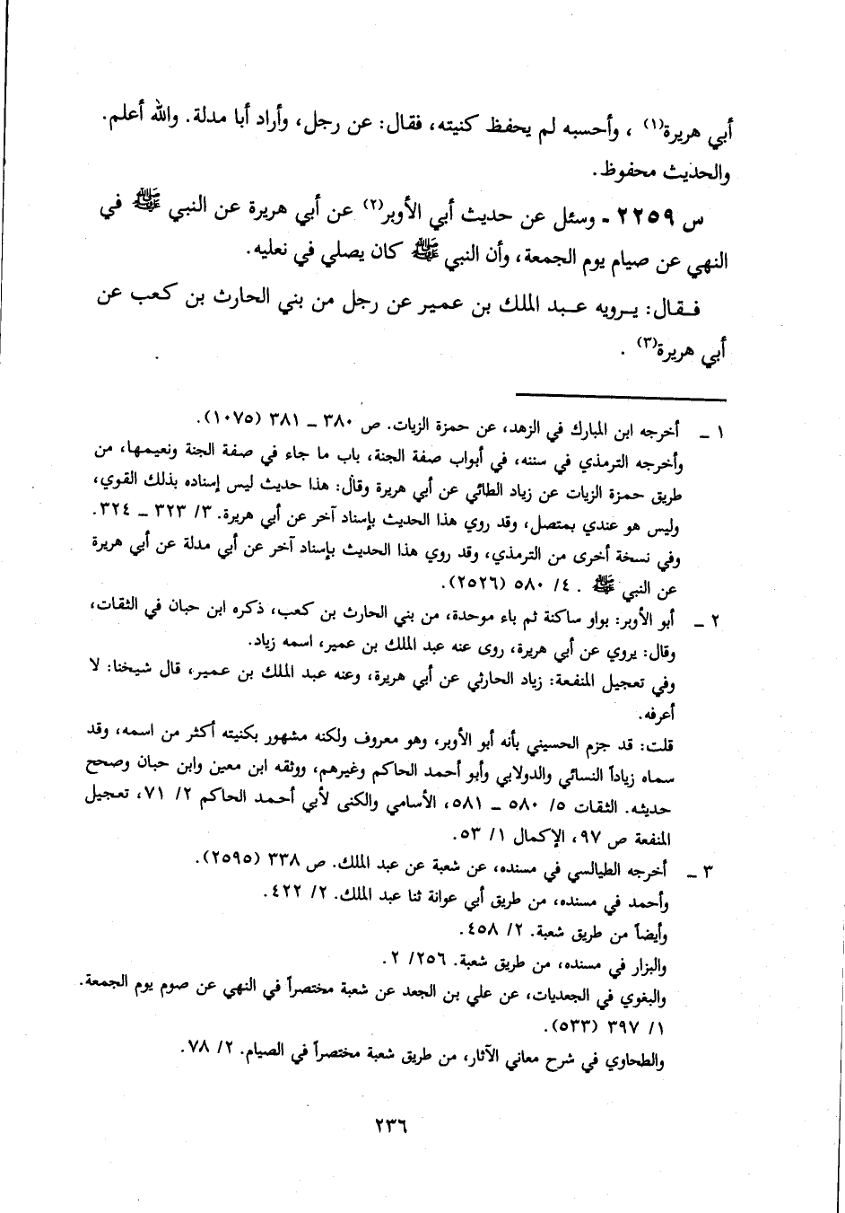 2259- وَسُئِلَ عَنْ حَدِيثِ أَبِي الْأَوْبَرِ، عَنْ أَبِي هريرة، عن النبي صلى الله عليه وسلم فِي النَّهِيِ عَنْ صِيَامِ يَوْمِ الْجُمُعَةِ، وَأَنَّ النَّبِيَّ صَلَّى اللَّهُ عَلَيْهِ وَسَلَّمَ، كَانَ يُصَلِّي فِي نَعْلَيْهِ.