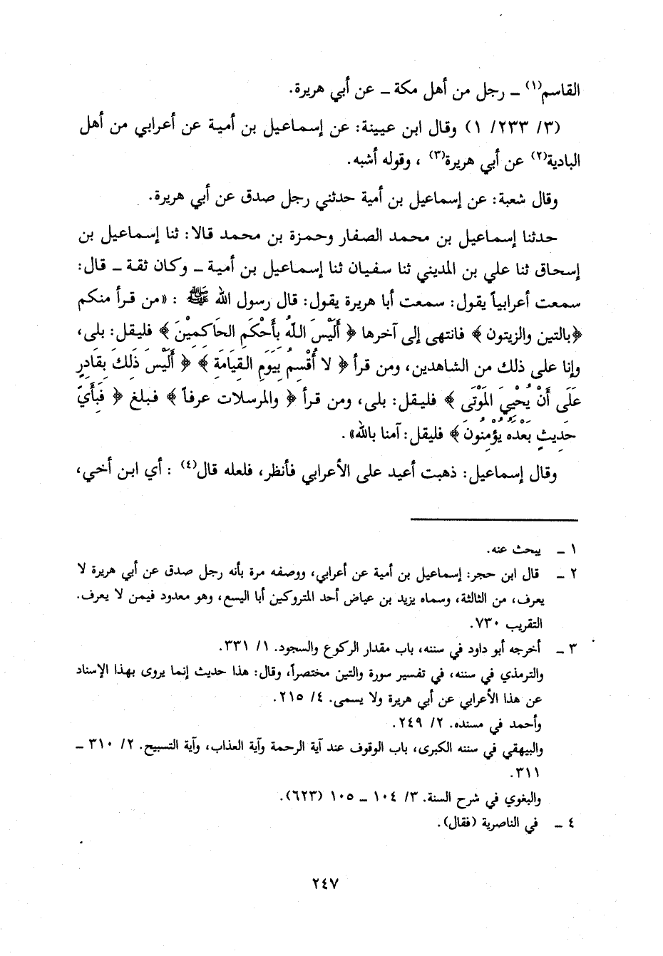 حَدَّثَنَا إِسْمَاعِيلُ بْنُ مُحَمَّدٍ الصَّفَّارُ، وَحَمْزَةُ بْنُ مُحَمَّدٍ، قالا: حدثنا إسماعيل بن إسحاق، حدثنا علي بن المديني، حدثنا سفيان، حدثنا إِسْمَاعِيلُ بْنُ أُمَيَّةَ، وَكَانَ ثِقَةً، قَالَ: سَمِعْتُ أَعْرَابِيًّا يَقُولُ: سَمِعْتُ أَبَا هُرَيْرَةَ، يَقُولُ: قَالَ رَسُولُ اللَّهِ صَلَّى الله عليه وسلم: من قَرَأَ مِنْكُمْ: بِـ {التِّينِ وَالزَّيْتُونِ} فَانْتَهَى إِلَى آخرها {أليس الله بأحكم الحاكمين} فَلْيَقُلْ: بَلَى، وَإِنَّا عَلَى ذَلِكَ مِنَ الشَّاهِدِينَ، وَمَنْ قَرَأَ: {لا أُقْسِمُ بِيَوْمِ الْقِيَامَةِ} {أَلَيْسَ ذلك بقادر على أن يحيي الموتى} فَلْيَقُلْ: بَلَى، وَمَنْ قَرَأَ: {وَالْمُرْسَلاتِ عُرْفًا} فبَلَغَ {فبأي حديث بعده يؤمنون} فَلْيَقُلْ: آمَنَّا بِاللَّهِ.