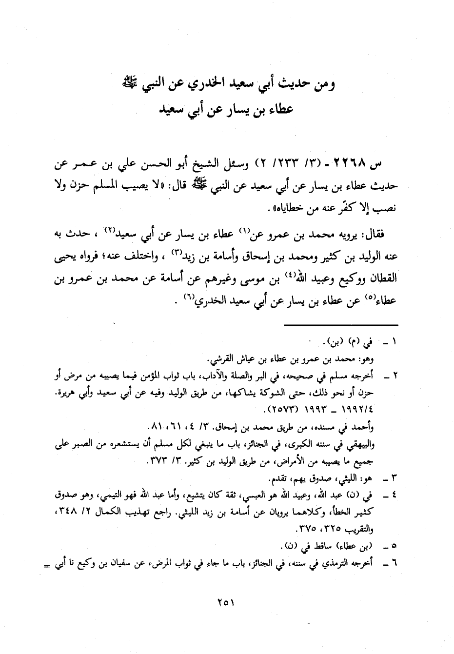 2268- وَسُئِلَ الشَّيْخُ أَبُو الْحَسَنِ عَلِيُّ بْنُ عُمَرَ، عَنْ حَدِيثِ عَطَاءِ بْنِ يَسَارٍ، عَنْ أَبِي سَعِيدٍ، عَنِ النَّبِيِّ صَلَّى اللَّهُ عَلَيْهِ وَسَلَّمَ، قَالَ: لَا يُصِيبُ الْمُسْلِمُ حُزْنٌ وَلَا نَصَبٌ إِلَّا كَفَّرَ عَنْهُ مِنْ خَطَايَاهُ.