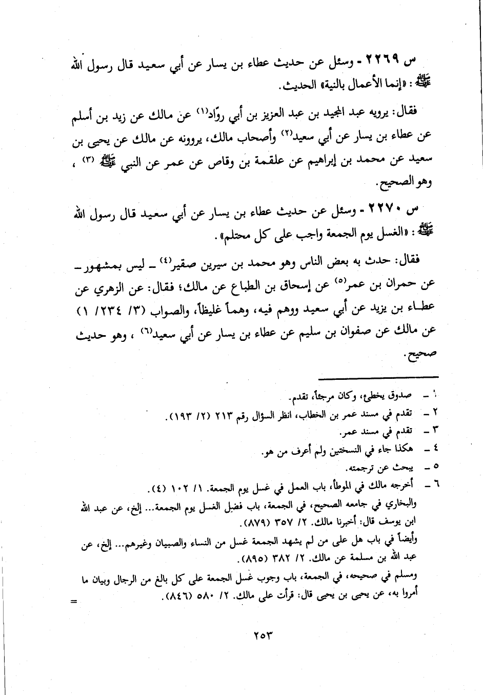 2269- وَسُئِلَ عَنْ حَدِيثِ عَطَاءِ بْنِ يَسَارٍ، عَنْ أَبِي سَعِيدٍ، قَالَ رَسُولُ اللَّهِ صَلَّى اللَّهُ عَلَيْهِ وَسَلَّمَ: إِنَّمَا الْأَعْمَالُ بِالنِّيَّةِ ... الْحَدِيثَ.