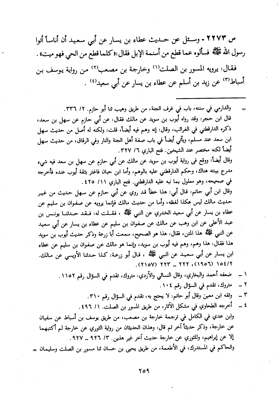 2273- وَسُئِلَ عَنْ حَدِيثِ عَطَاءِ بْنِ يَسَارٍ، عَنْ أَبِي سَعِيدٍ، أَنَّ أُنَاسًا أَتَوْا رَسُولَ اللَّهِ صَلَّى اللَّهُ عَلَيْهِ وَسَلَّمَ، فَسَأَلُوهُ عَمَّا قُطِعَ مِنْ أَسْنِمَةِ الْإِبِلِ، فَقَالَ: كُلُّ مَا قُطِعَ مِنَ الْحَيِّ فَهُوَ مَيِّتٌ.