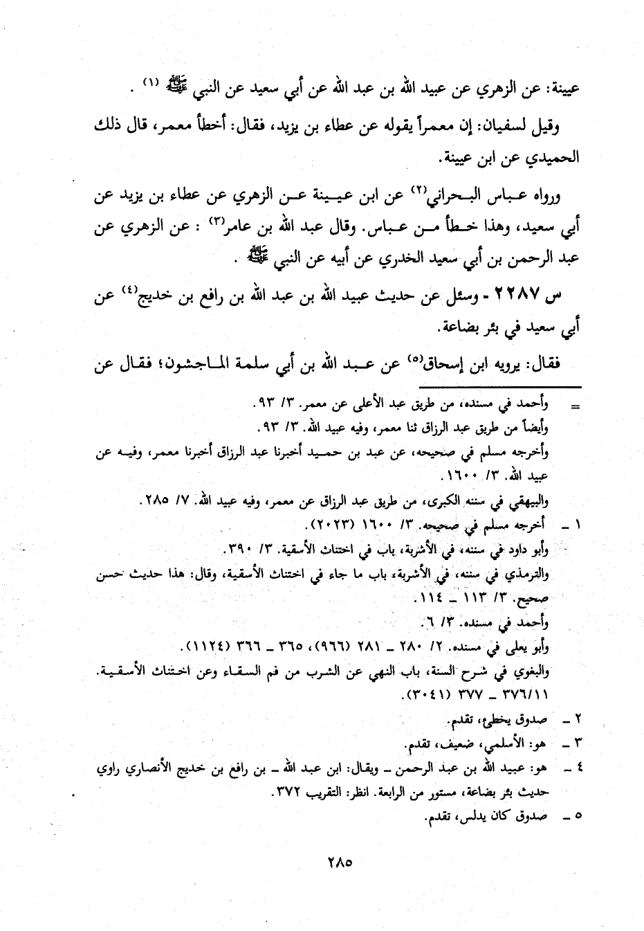 2287- وَسُئِلَ عَنْ حَدِيثِ عُبَيْدِ اللَّهِ بْنِ عَبْدِ اللَّهِ بْنِ رَافِعِ بْنِ خَدِيجٍ، عَنْ أَبِي سَعِيدٍ فِي بِئْرِ بُضَاعَةَ.
