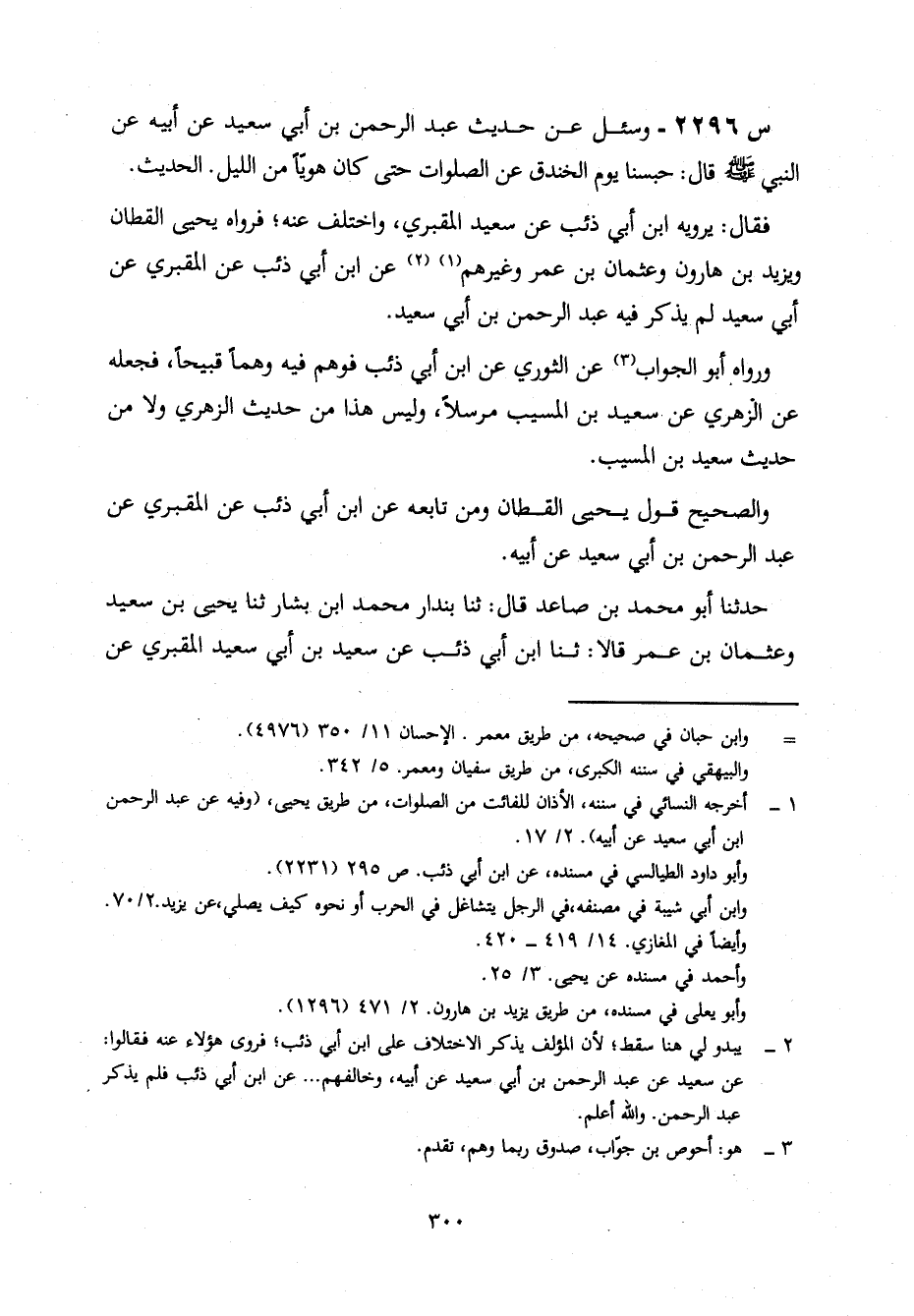 2296- وَسُئِلَ عَنْ حَدِيثِ عَبْدِ الرَّحْمَنِ بْنِ أَبِي سَعِيدٍ، عَنْ أَبِيهِ، عَنِ النَّبِيِّ صَلَّى اللَّهُ عَلَيْهِ وَسَلَّمَ، قَالَ: حُبِسْنَا يَوْمَ الْخَنْدَقِ عَنِ الصَّلَوَاتِ حَتَّى كَانَ هَوِيًّا مِنَ اللَّيْلِ ... الْحَدِيثَ.