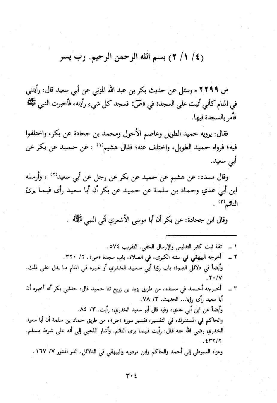 2299- وَسُئِلَ عَنْ حَدِيثِ بَكْرِ بْنِ عَبْدِ اللَّهِ الْمُزَنِيِّ، عَنْ أَبِي سَعِيدٍ، قَالَ: رَأَيْتُنِي فِي الْمَنَامِ كَأَنِّي أَتَيْتُ عَلَى السَّجْدَةِ فِي ص فَسَجَدَ كُلُّ شَيْءٍ رَأَيْتُهُ، فَأَخْبَرْتُ النَّبِيَّ صَلَّى اللَّهُ عَلَيْهِ وَسَلَّمَ، فَأَمَرَ بِالسَّجْدَةِ فِيهَا.