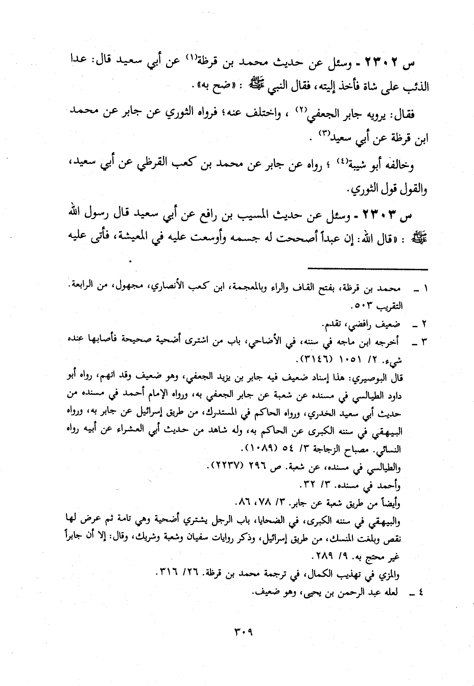 2302- وَسُئِلَ عَنْ حَدِيثِ مُحَمَّدِ بْنِ قَرَظَةَ، عَنْ أَبِي سَعِيدٍ، قَالَ: عَدَا الذِّئْبُ عَلَى شَاةٍ فأخذ إليته، فَقَالَ النَّبِيُّ صَلَّى اللَّهُ عَلَيْهِ وَسَلَّمَ: ضَحِّ به.