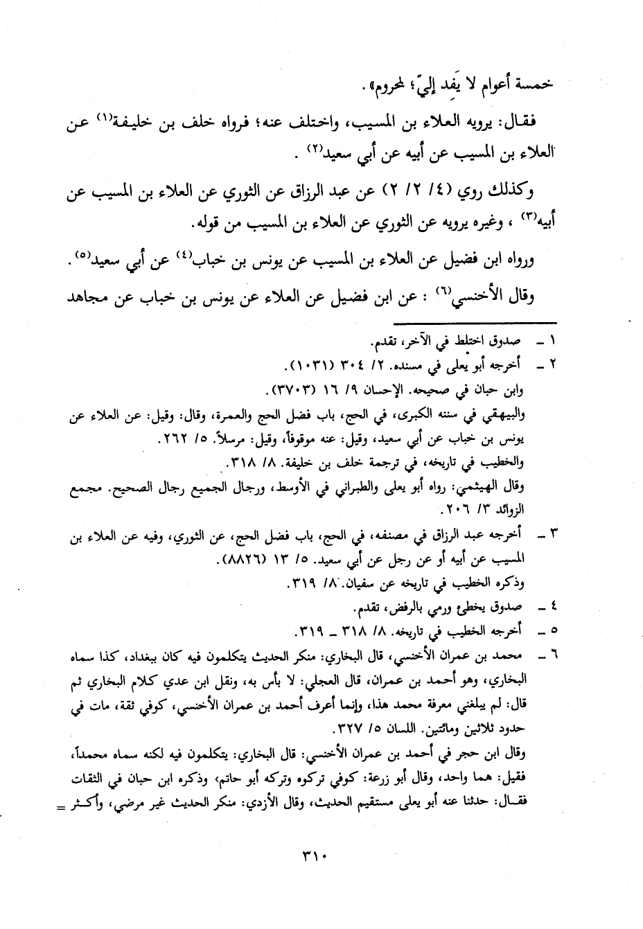 وَقَالَ الْأَخْنَسِيُّ: عَنِ ابْنِ فُضَيْلٍ، عَنِ الْعَلَاءِ، عَنْ يُونُسَ بْنِ خَبَّابٍ، عَنْ مُجَاهِدٍ، عَنْ أَبِي سَعِيدٍ، وَلَا يَصِحُّ مِنْهَا شَيْءٌ.