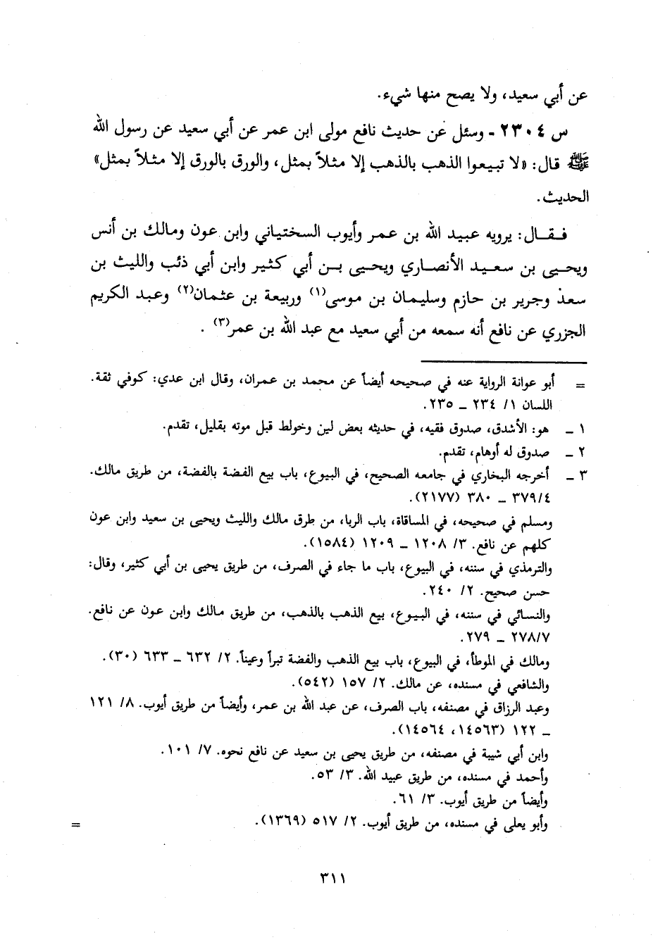 2304- وَسُئِلَ عَنْ حَدِيثِ نَافِعٍ مَوْلَى ابْنِ عُمَرَ، عَنْ أَبِي سَعِيدٍ، عَنْ رَسُولِ اللَّهِ صَلَّى اللَّهُ عَلَيْهِ وَسَلَّمَ، قَالَ: لَا تَبِيعُوا الذَّهَبَ بِالذَّهَبِ، إِلَّا مِثْلًا بِمِثْلٍ، وَالْوَرَقَ بِالْوَرَقِ إِلَّا مِثْلًا بِمِثْلٍ ... الْحَدِيثَ.