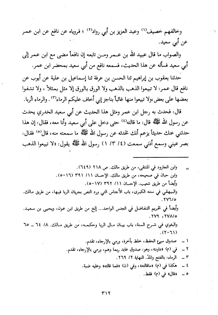 قَالَ: فَحَدَّثَ بِهِ رَجُلٌ ابْنَ عُمَرَ، وَمِثْلُ هَذَا الْحَدِيثِ عَنْ أَبِي سَعِيدٍ الْخُدْرِيِّ، يُحَدِّثُ عَنْ رَسُولِ اللَّهِ صَلَّى اللَّهُ عَلَيْهِ وَسَلَّمَ، قَالَ: مَا قَالَتْهُ حَتَّى دَخَلَ عَلَى أَبِي سَعِيدٍ، وَأَنَا مَعَهُ، فَقَالَ: إِنَّ هَذَا حَدَّثَنِي عَنْكَ حَدِيثًا يَزْعُمُ أَنَّكَ تُحَدِّثُهُ عَنْ رَسُولِ اللَّهِ صَلَّى اللَّهُ عَلَيْهِ وَسَلَّمَ، مَا سَمِعْتُهُ مِنْهُ، قَالَ: فَقَالَ: بَصُرَ عَيْنِي وَسَمِعَ أُذُنِي سَمِعْتُ رَسُولَ اللَّهِ صَلَّى اللَّهُ عَلَيْهِ وَسَلَّمَ، يَقُولُ: لَا تَبِيعُوا الذَّهَبَ بِالذَّهَبِ، وَلَا الْوَرَقَ بِالْوَرَقِ إِلَّا مثلا بمثل، ولا تشفوا بعضها على بعض، لَا تَبِيعُوا شَيْئًا غَائِبًا بِنَاجِزٍ.