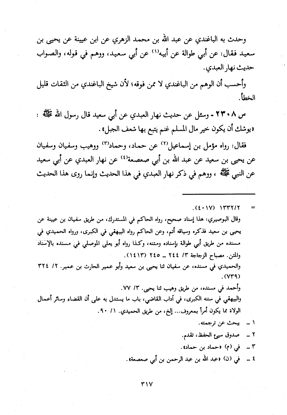 2308- وَسُئِلَ عَنْ حَدِيثِ نَهَارٍ الْعَبْدِيِّ، عَنْ أَبِي سَعِيدٍ، قَالَ رَسُولُ اللَّهِ صَلَّى اللَّهُ عَلَيْهِ وَسَلَّمَ: يُوشِكُ أَنْ يَكُونَ خَيْرُ مَالِ الْمُسْلِمِ غَنَمًا يَتْبَعُ بِهَا شَعَفَ الْجَبَلِ.