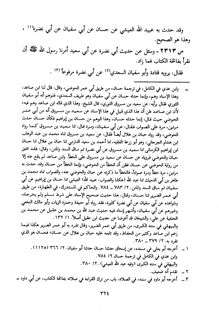 2313- وَسُئِلَ عَنْ حَدِيثِ أَبِي نَضْرَةَ، عَنْ أَبِي سَعِيدٍ، أَمَرَنَا رَسُولُ اللَّهِ صَلَّى اللَّهُ عَلَيْهِ وَسَلَّمَ، أَنْ نَقْرَأَ بِفَاتِحَةِ الْكِتَابِ فَمَا زَادَ.