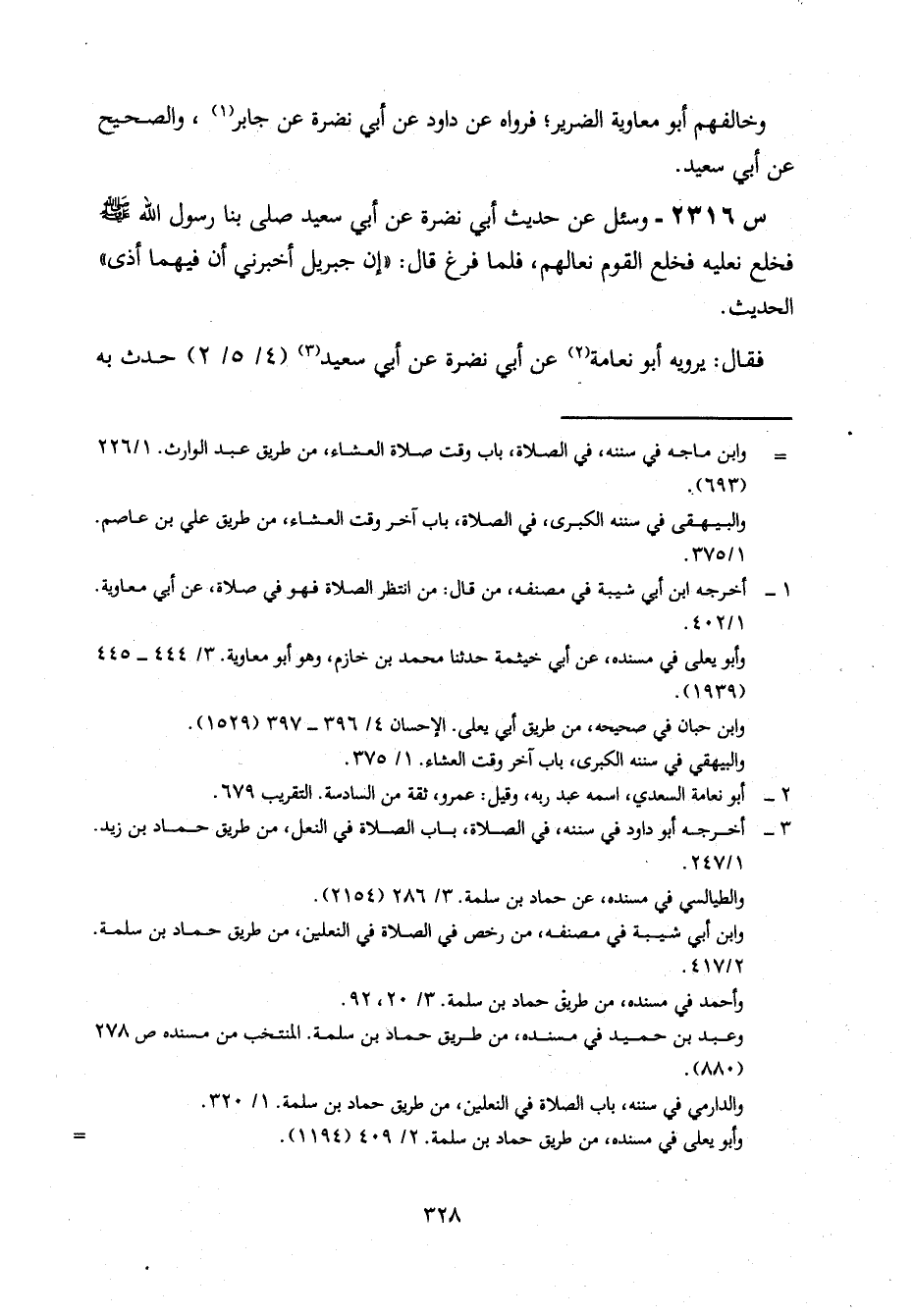 2316- وَسُئِلَ عَنْ حَدِيثِ أَبِي نَضْرَةَ، عَنْ أَبِي سَعِيدٍ، صَلَّى بِنَا رَسُولُ اللَّهِ صَلَّى اللَّهُ عَلَيْهِ وَسَلَّمَ، فَخَلَعَ نَعْلَيْهِ فَخَلَعَ الْقَوْمُ نِعَالَهُمْ، فَلَمَّا فَرَغَ، قَالَ: إِنَّ جِبْرِيلَ أَخْبَرَنِي أَنَّ فيهما أذى، ... الحديث.