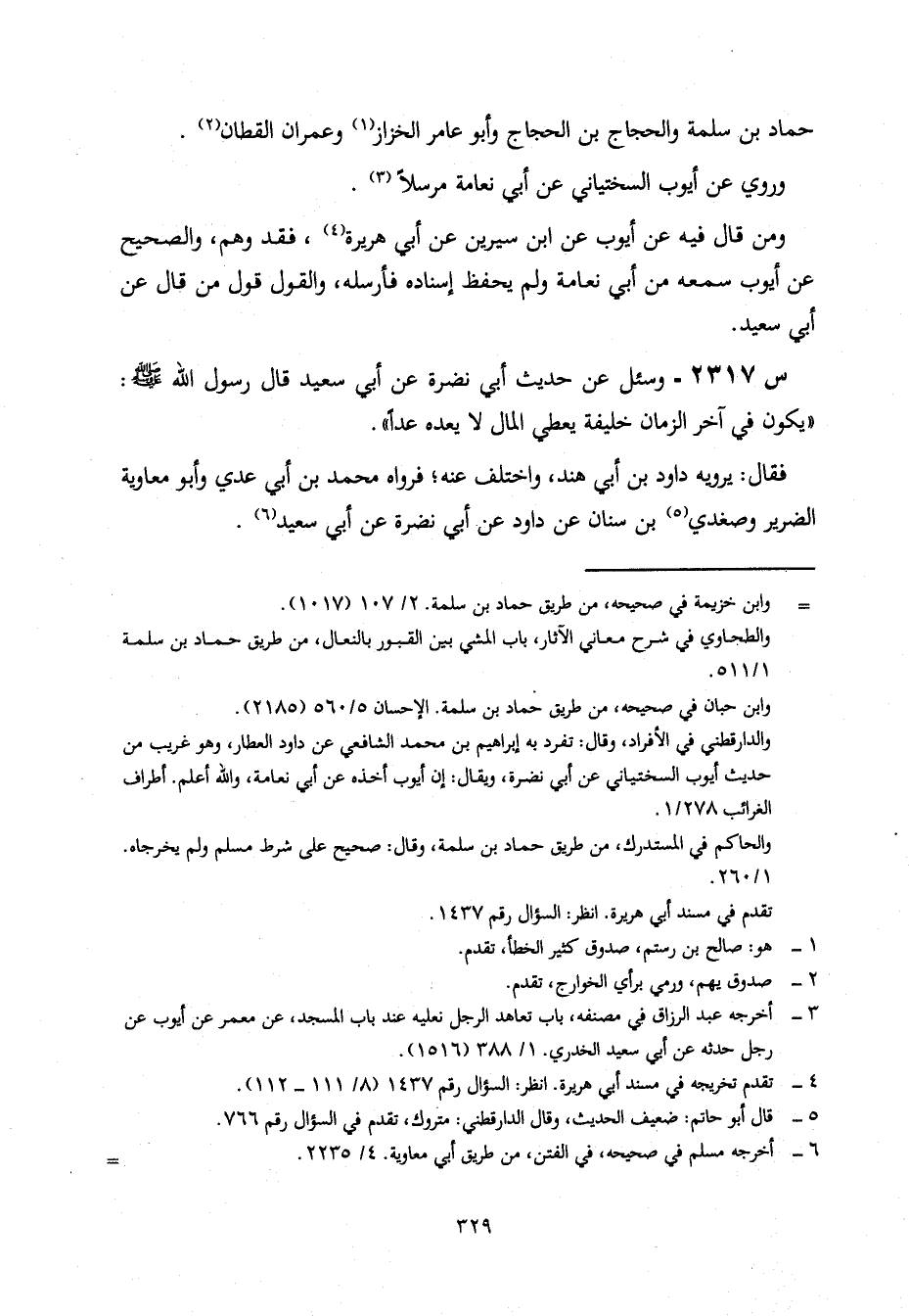 2317- وَسُئِلَ عَنْ حَدِيثِ أَبِي نَضْرَةَ، عَنْ أَبِي سَعِيدٍ، قَالَ رَسُولُ اللَّهِ صَلَّى اللَّهُ عَلَيْهِ وَسَلَّمَ: يَكُونُ فِي آخِرِ الزَّمَانِ خَلِيفَةٌ يُعْطِي الْمَالَ لَا يَعُدُّهُ عَدًّا.