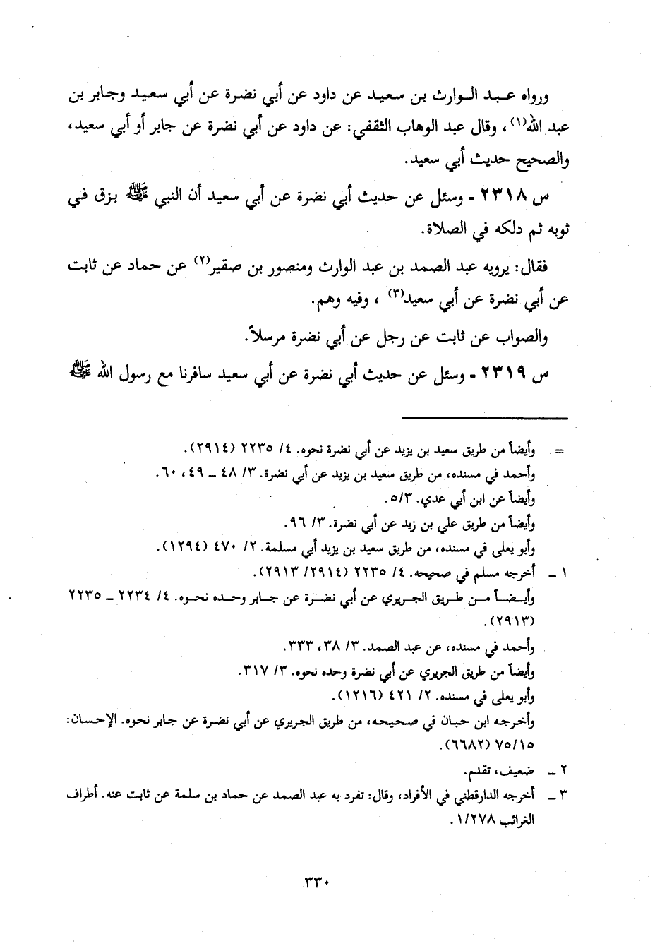 2318- وَسُئِلَ عَنْ حَدِيثِ أَبِي نَضْرَةَ، عَنْ أَبِي سعيد، أن النبي صلى الله عليه وسلم، بَزَقَ فِي ثَوْبِهِ ثُمَّ دَلَّكَهُ فِي الصَّلَاةِ.