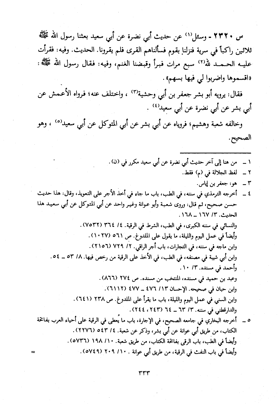 2320- وَسُئِلَ عَنْ حَدِيثِ أَبِي نَضْرَةَ، عَنْ أَبِي سَعِيدٍ، بعَثَنَا رَسُولُ اللَّهِ صَلَّى اللَّهُ عَلَيْهِ وَسَلَّمَ ثَلَاثِينَ رَاكِبًا فِي سَرِيَّةٍ، فَنَزَلْنَا بِقَوْمٍ، فَسَأَلْنَاهُمُ الْقِرَى، فَلَمْ يُقْرُونَا الْحَدِيثَ وَفِيهِ: فَقَرَأْتُ عَلَيْهِ الْحَمْدُ لِلَّهِ سَبْعَ مَرَّاتٍ فَبَرِئَ، وَقَبَضْنَا الْغَنَمَ، وَفِيهِ: فَقَالَ رَسُولُ اللَّهِ صَلَّى اللَّهُ عَلَيْهِ وسلم: اقسموها واضربوا لي فيها بسهم.