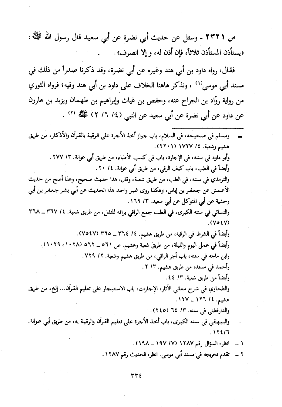 2321- وَسُئِلَ عَنْ حَدِيثِ أَبِي نَضْرَةَ، عَنْ أَبِي سَعِيدٍ، قَالَ رَسُولُ اللَّهِ صَلَّى اللَّهُ عَلَيْهِ وَسَلَّمَ: يَسْتَأْذِنُ الْمُسْتَأْذِنُ ثَلَاثًا، فَإِنْ أُذِنَ لَهُ، وإلا انصرف.