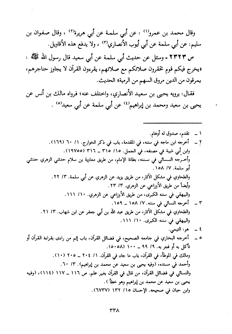 2323- وَسُئِلَ عَنْ حَدِيثِ أَبِي سَلَمَةَ، عَنْ أَبِي سَعِيدٍ، قَالَ رَسُولُ اللَّهِ صَلَّى اللَّهُ عَلَيْهِ وَسَلَّمَ: يَخْرُجُ فِيكُمْ قَوْمٌ تَحْقِرُونَ صلاتكم مع صلاتهم، يقرؤون الْقُرْآنَ لَا يُجَاوِزُ حَنَاجِرَهُمْ، يَمْرُقُونَ مِنَ الدِّينِ مُرُوقَ السَّهْمِ مِنَ الرَّمِيَّةِ ... الْحَدِيثَ.