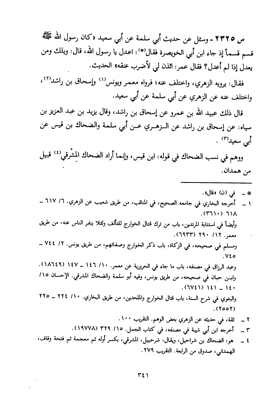 2325- وَسُئِلَ عَنْ حَدِيثِ أَبِي سَلَمَةَ، عَنْ أَبِي سَعِيدٍ، كَانَ رَسُولُ اللَّهِ صَلَّى اللَّهُ عَلَيْهِ وَسَلَّمَ قَسَمَ قَسْمًا إِذْ جَاءَ ابْنُ أَبِي الْخُوَيْصِرَةِ، فَقَالَ: اعْدِلْ يَا رَسُولَ اللَّهِ، قَالَ: وَيْلَكَ وَمَنْ يَعْدِلُ إِذَا لَمْ أَعْدِلْ؟ فَقَالَ عُمَرُ: ائْذَنْ لِي لِأَضْرِبَ عُنُقَهُ ... الْحَدِيثَ.