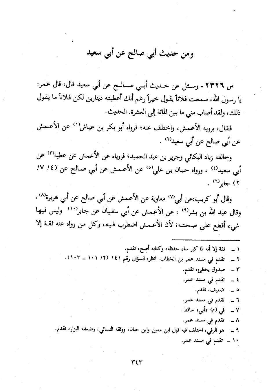 2326- وَسُئِلَ عَنْ حَدِيثِ أَبِي صَالِحٍ، عَنْ أَبِي سَعِيدٍ قَالَ: قَالَ عُمَرُ: يَا رَسُولَ اللَّهِ، سَمِعْتُ فُلَانًا يَقُولُ خَيْرًا رَغْمَ أَنَّكَ أَعْطَيْتَهُ دِينَارَيْنِ لَكِنَّ فُلَانًا مَا يَقُولُ ذَلِكَ، وَلَقَدْ أصاب مني ما بين المئة إِلَى الْعَشَرَةِ، الْحَدِيثَ.