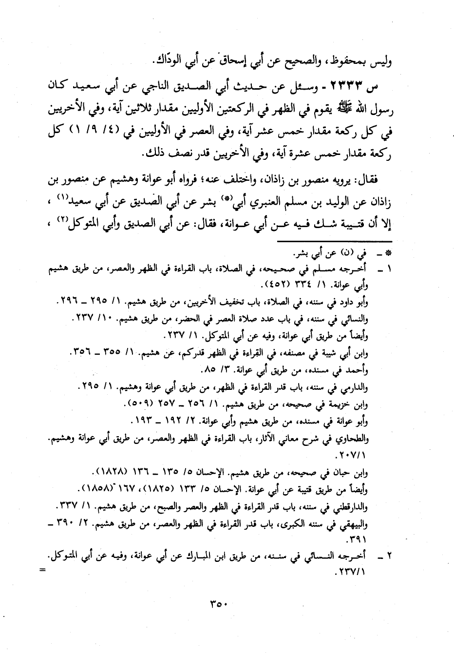 2333- وَسُئِلَ عَنْ حَدِيثِ أَبِي الصِّدِّيقِ النَّاجِيِّ، عَنِ أَبِي سَعِيدٍ كَانَ رَسُولُ اللَّهِ صَلَّى اللَّهُ عَلَيْهِ وَسَلَّمَ يَقُومُ فِي الظُّهْرِ فِي الرَّكْعَتَيْنِ الْأُولَيَيْنِ مِقْدَارَ ثَلَاثِينَ آيَةً، وَفِي الْأُخْرَيَيْنِ فِي كُلِّ رَكْعَةٍ مِقْدَارَ خَمْسَ عَشْرَةَ آيَةً، وَفِي الْعَصْرِ فِي الْأُولَيَيْنِ فِي كُلِّ رَكْعَةٍ مِقْدَارَ خَمْسَ عَشْرَةَ آيَةً، وَفِي الْأُخْرَيَيْنِ قَدْرَ نِصْفِ ذَلِكَ.