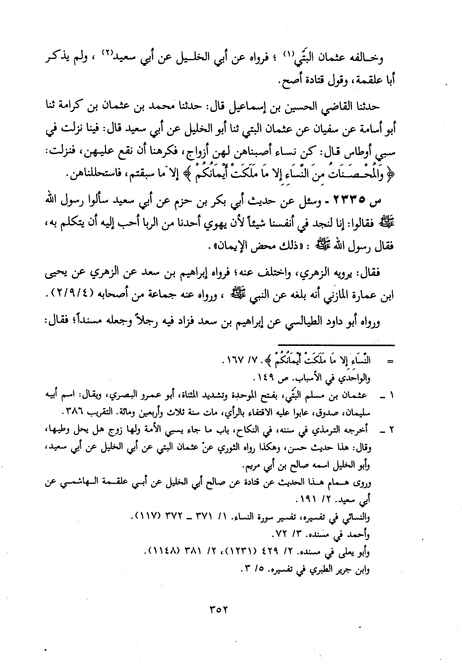 2335- وَسُئِلَ عَنْ حَدِيثِ أَبِي بَكْرِ بْنِ حَزْمٍ، عَنْ أَبِي سَعِيدٍ، سَأَلُوا رَسُولَ اللَّهِ صَلَّى اللَّهُ عَلَيْهِ وَسَلَّمَ، فَقَالُوا: إِنَّا لَنَجِدُ فِي أَنْفُسِنَا شَيْئًا لِأَنْ يَهْوِيَ أَحَدُنَا مِنَ الرُّبَا أَحَبُّ إِلَيْهِ أَنْ يَتَكَلَّمَ بِهِ، فَقَالَ رَسُولُ اللَّهِ صَلَّى اللَّهُ عَلَيْهِ وَسَلَّمَ: ذَلِكَ مَحْضُ الْإِيمَانِ.