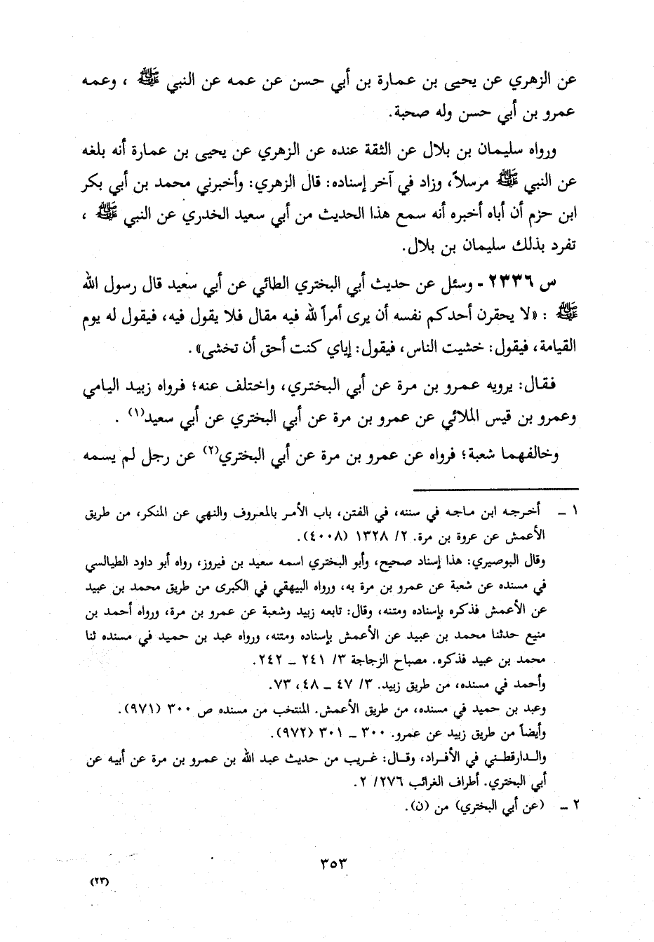 2336- وَسُئِلَ عَنْ حَدِيثِ أَبِي الْبَخْتَرِيِّ الطَّائِيِّ، عَنْ أَبِي سَعِيدٍ، قَالَ رَسُولُ اللَّهِ صَلَّى اللَّهُ عَلَيْهِ وَسَلَّمَ: لَا يَحْقِرَنَّ أَحَدُكُمْ نَفْسَهُ أَنْ يَرَى أَمْرًا لِلَّهِ فِيهِ مَقَالٌ، فَلَا يَقُولُ فِيهِ، فَيَقُولُ لَهُ يَوْمَ الْقِيَامَةِ، فَيَقُولُ: خَشِيتُ النَّاسَ، فَيَقُولُ: إِيَّايَ كُنْتَ أَحَقَّ أَنْ تَخْشَى.
