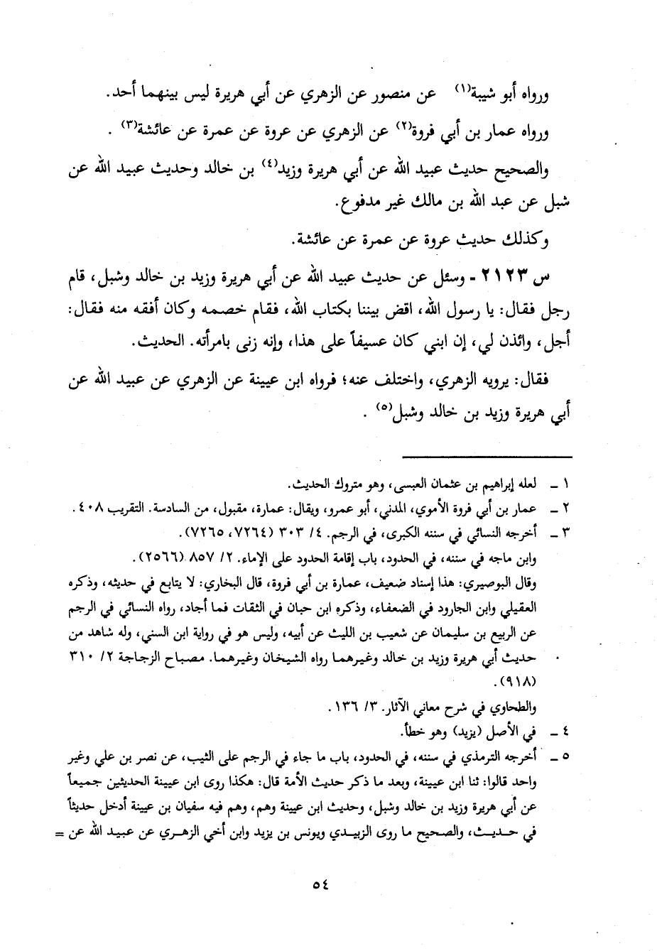 2123- وَسُئِلَ عَنْ حَدِيثِ عُبَيْدِ اللَّهِ، عَنْ أَبِي هُرَيْرَةَ، وَزَيْدِ بْنِ خَالِدٍ، وَشِبْلٍ، قَامَ رَجُلٌ، فَقَالَ: يَا رَسُولَ اللَّهِ، اقْضِ بَيْنَنَا بِكِتَابِ اللَّهِ، فَقَامَ خَصْمُهُ، وَكَانَ أَفْقَهَ مِنْهُ، فَقَالَ: أَجَلْ، وَائْذَنْ لِي، إِنَّ ابْنِي كَانَ عَسِيفًا عَلَى هَذَا، وَإِنَّهُ زَنَى بِامْرَأَتِهِ.... الْحَدِيثَ.
