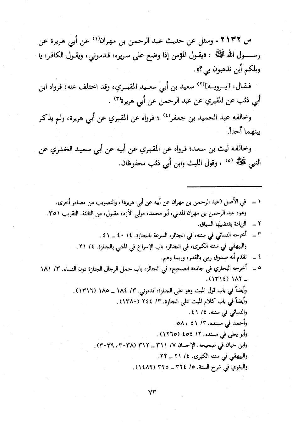 2132- وَسُئِلَ عَنْ حَدِيثِ عَبْدِ الرَّحْمَنِ بْنِ مِهْرَانَ، عَنْ أَبِي هُرَيْرَةَ، عَنْ رَسُولِ اللَّهِ صَلَّى اللَّهُ عَلَيْهِ وَسَلَّمَ: يَقُولُ الْمُؤْمِنُ إِذَا وُضِعَ عَلَى سَرِيرِهِ: قَدِّمُونِي، وَيَقُولُ الْكَافِرُ: يَا وَيْلَكُمْ أَيْنَ تَذْهَبُونَ بِي؟.