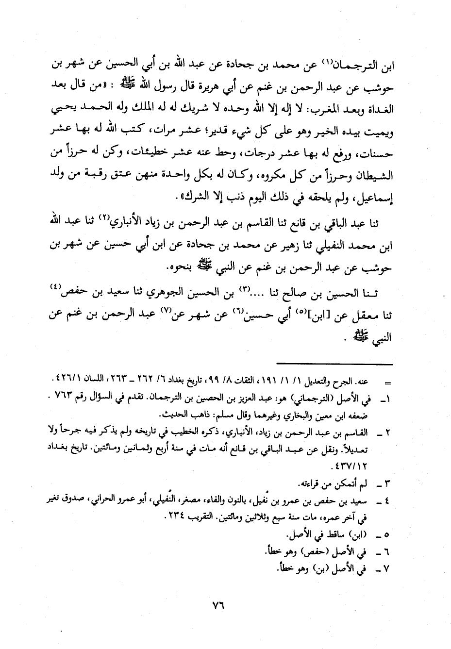 عَنْ مُحَمَّدِ بْنِ جُحَادَةَ، عَنْ عَبْدِ اللَّهِ بْنِ أَبِي الْحُسَيْنِ، عَنْ شَهْرِ بْنِ حَوْشَبٍ، عَنْ عَبْدِ الرَّحْمَنِ بْنِ غُنْمٍ، عَنْ أَبِي هريرة، قال رسول الله صلى الله عليه وَسَلَّمَ: مَنْ قَالَ بَعْدَ الْغَدَاةِ وَبَعْدَ الْمَغْرِبِ: لَا إِلَهَ إِلَّا اللَّهُ وَحْدَهُ لَا شَرِيكَ لَهُ، لَهُ الْمُلْكُ وَلَهُ الْحَمْدُ يُحْيِي وَيُمِيتُ بِيَدِهِ الْخَيْرُ، وَهُوَ عَلَى كُلِّ شَيْءٍ قَدِيرٌ، عَشْرَ مَرَّاتٍ، كَتَبَ اللَّهُ لَهُ بِهَا عَشْرَ حَسَنَاتٍ، وَرَفَعَ لَهُ بِهَا عَشْرَ دَرَجَاتٍ، وَحَطَّ عَنْهُ عَشْرَ خَطِيئَاتٍ، وَكُنَّ لَهُ حِرْزًا مِنَ الشَّيْطَانِ وَحِرْزًا مِنْ كُلِّ مَكْرُوهٍ، وَكَانَ لَهُ بِكُلِّ وَاحِدَةٍ مِنْهُنَّ عِتْقُ رَقَبَةٍ مِنْ وَلَدِ إِسْمَاعِيلَ، وَلَمْ يَلْحَقْهُ فِي ذَلِكَ الْيَوْمِ ذَنْبٌ إلا الشرك.