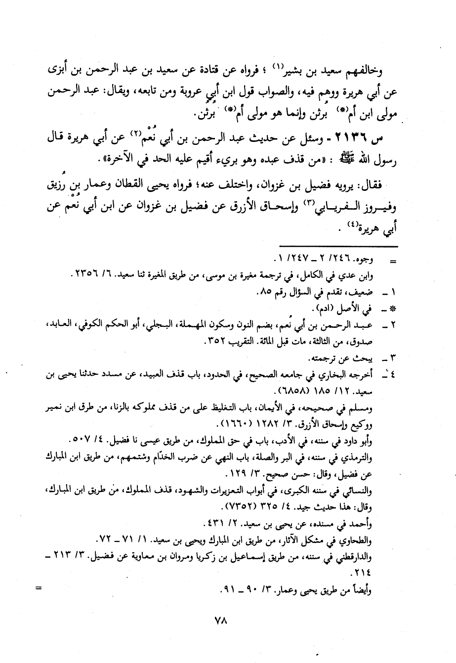 2136- وَسُئِلَ عَنْ حَدِيثِ عَبْدِ الرَّحْمَنِ بْنِ أَبِي نعم، عن أبي هريرة، قال رسول الله صَلَّى اللَّهُ عَلَيْهِ وَسَلَّمَ: مَنْ قَذَفَ عَبْدَهُ وَهُوَ بَرِيءٌ أُقِيمَ عَلَيْهِ الْحَدُّ فِي الْآخِرَةِ.