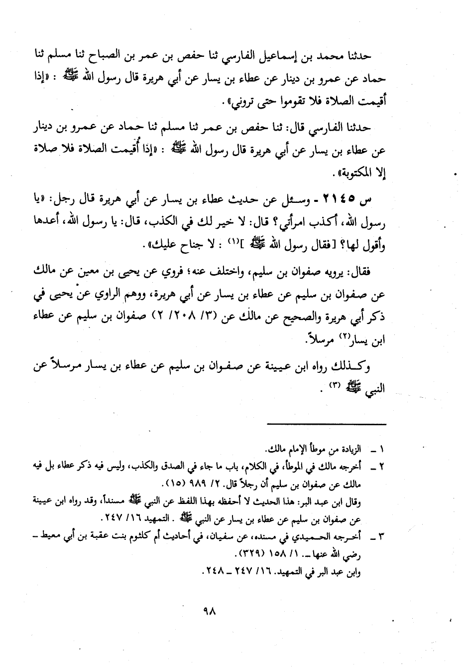 2145- وَسُئِلَ عَنْ حَدِيثِ عَطَاءِ بْنِ يَسَارٍ، عَنْ أَبِي هُرَيْرَةَ، قَالَ رَجُلٌ: يَا رَسُولَ اللَّهِ، أَكْذِبُ امْرَأَتِي؟ قَالَ: لَا خَيْرَ لَكَ فِي الْكَذِبِ، قَالَ: يَا رَسُولَ اللَّهِ، أَعِدُهَا وَأَقُولُ لَهَا؟ فَقَالَ رَسُولُ اللَّهِ صَلَّى اللَّهُ عَلَيْهِ وَسَلَّمَ: لَا جُنَاحَ عَلَيْكَ.