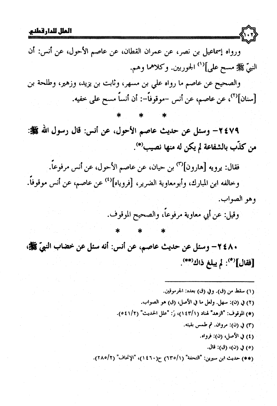 2479- وسئل عن حديث عاصم الأحول، عن أنس، قال رسول الله صلى الله عليه وسلم: من كذب بالشفاعة لم يكن له منها نصيب.