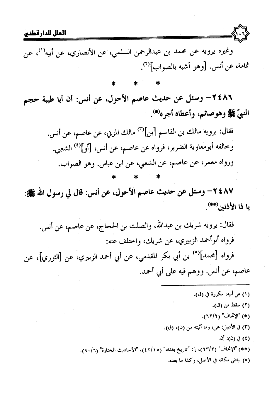 2486- وسئل عن حديث عاصم الأحول، عن أنس أن أبا طيبة حجم النبي صلى الله عليه وسلم وهو صائم، وأعطاه أجره.
