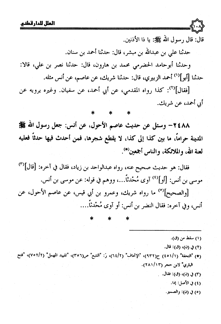 2488- وسئل عن حديث عاصم الأحول، عن أنس جعل رسول الله صلى الله عليه وسلم المدينة حراما، ما بين كذا إلى كذا، لا يقطع شجرها، فمن أحدث فيها حدثا فعليه لعنة الله، والملائكة، والناس أجمعين.