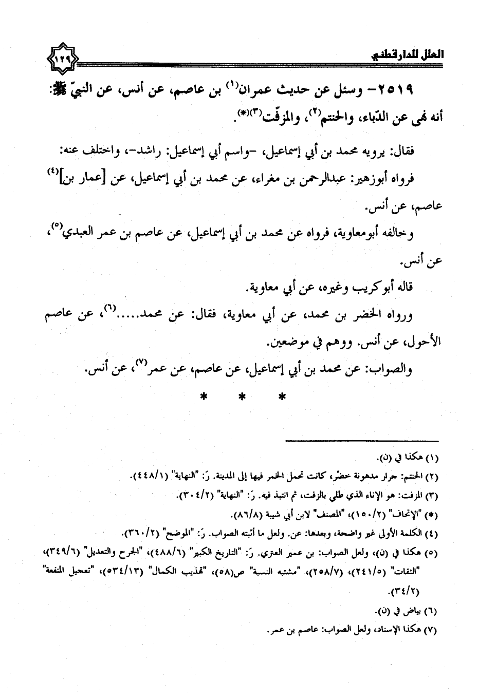 2519- وسئل عن حديث عمران بن عاصم، عَنْ أَنَسٍ، عَنِ النَّبِيِّ صَلَّى اللَّهُ عَلَيْهِ وسلم؛ أنه نهى عن الدباء، والحنتم، والمزفت.