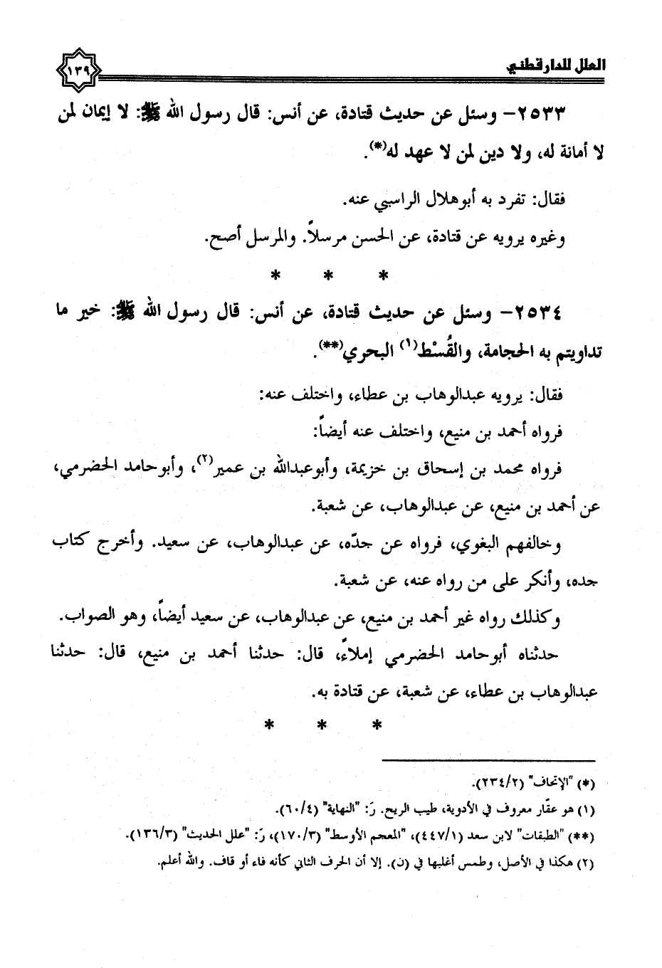 2533- وسئل عن حديث قتادة، عن أنس، قال رسول الله صلى الله عليه وسلم: لا إيمان لمن لا أمانة له، ولا دين لمن لا عهد له.