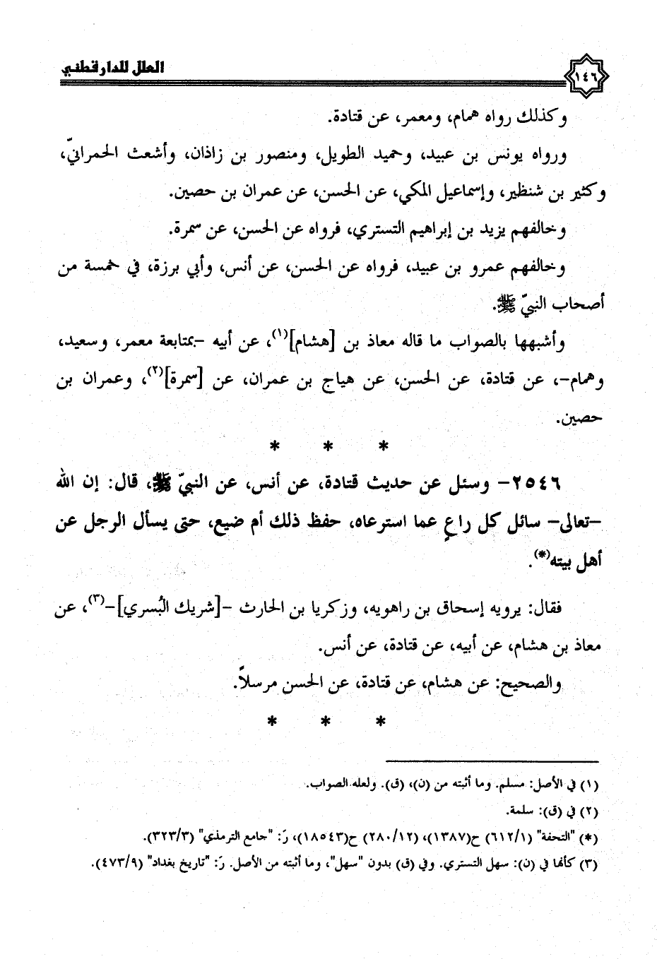 2546- وسئل عن حديث قَتَادَةَ، عَنْ أَنَسٍ، عَنِ النَّبِيِّ صَلَّى اللَّهُ عَلَيْهِ وسلم، قال: إن الله، تعالى، سائل كل راع عما استرعاه، حفظ ذلك أم ضيع، حتى يسأل الرجل عن أهل بيته.