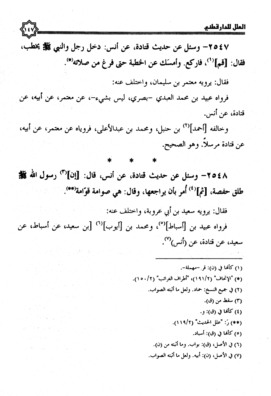 2548- وسئل عن حديث قتادة، عن أنس، قال: أن رسول الله صلى الله عليه وسلم طلق حفصة، ثم أمر بأن يراجعها، وقال: هي صوامة قوامة.