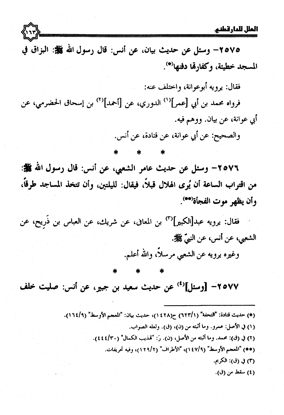 2576- وسئل عن حديث عامر الشعبي، عن أنس، قال رسول الله صلى الله عليه وسلم: من اقتراب الساعة أن يرى الهلال قبلا، فيقال: لليلتين، وأن تتخذ المساجد طرقا، وأن يظهر موت الفجأة.