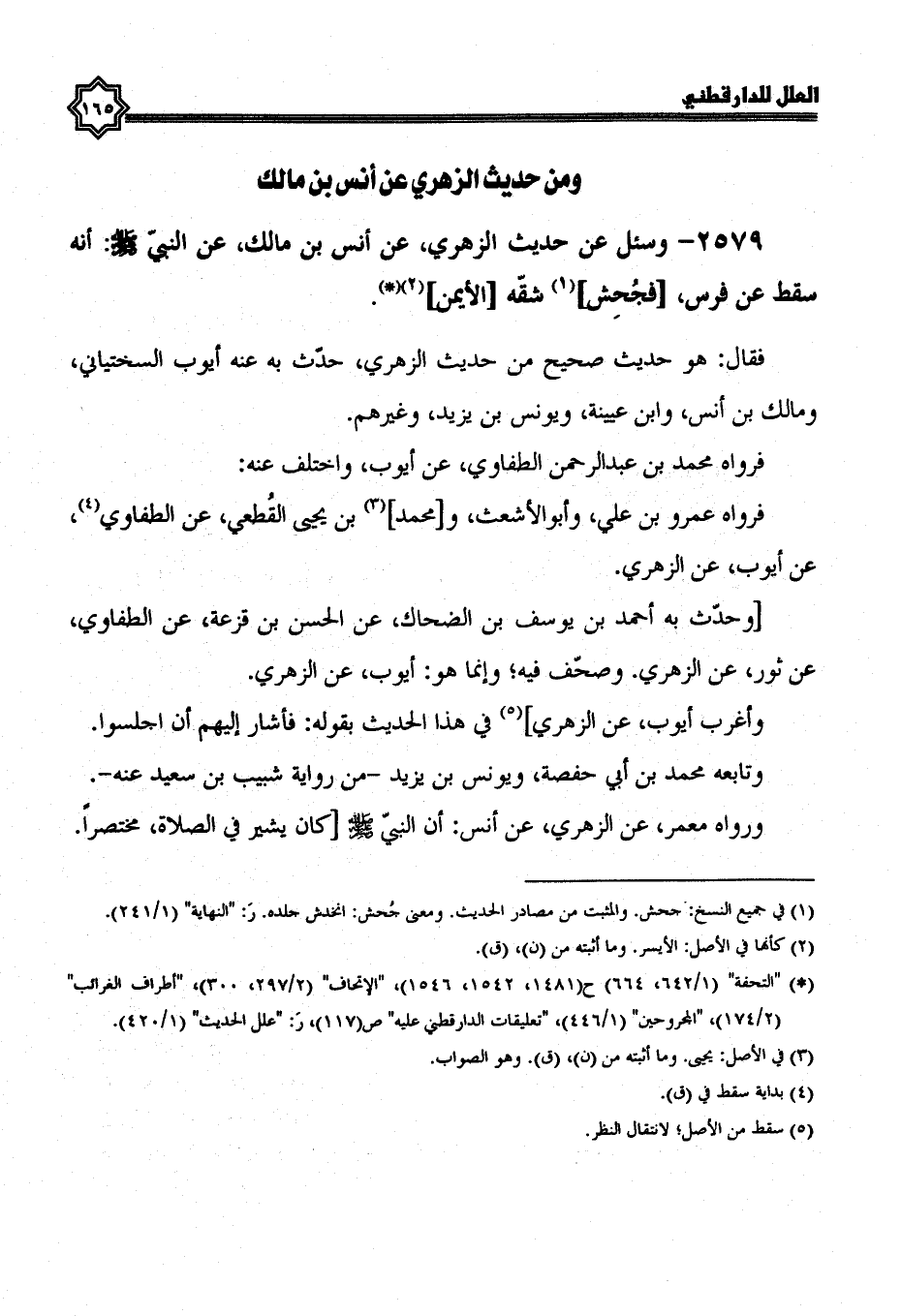 2579- وسئل عن حديث الزهري، عَنْ أَنَسِ بْنِ مَالِكٍ، عَنِ النَّبِيِّ صَلَّى الله عليه وسلم؛ أنه سقط عن فرس، فجحش شقه الأيمن.