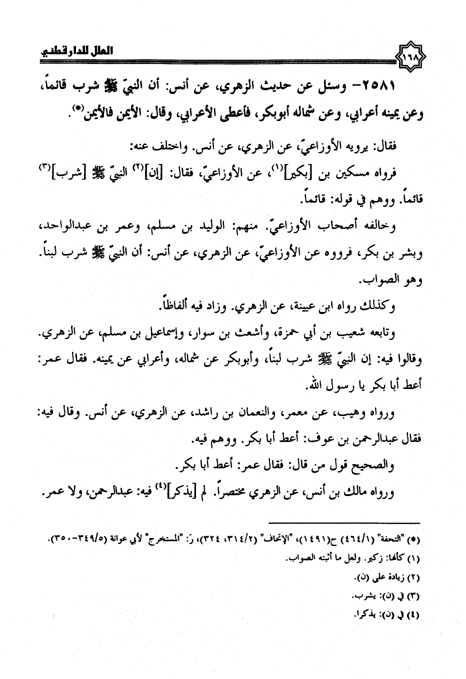 2581- وسئل عن حديث الزهري، عَنْ أَنَسٍ أَنَّ النَّبِيَّ صَلَّى اللَّهُ عَلَيْهِ وسلم شرب قائما، وعن يمينه أعرابي، وعن شماله أبو بكر، فأعطى الأعرابي، وقال: الأيمن فالأيمن.