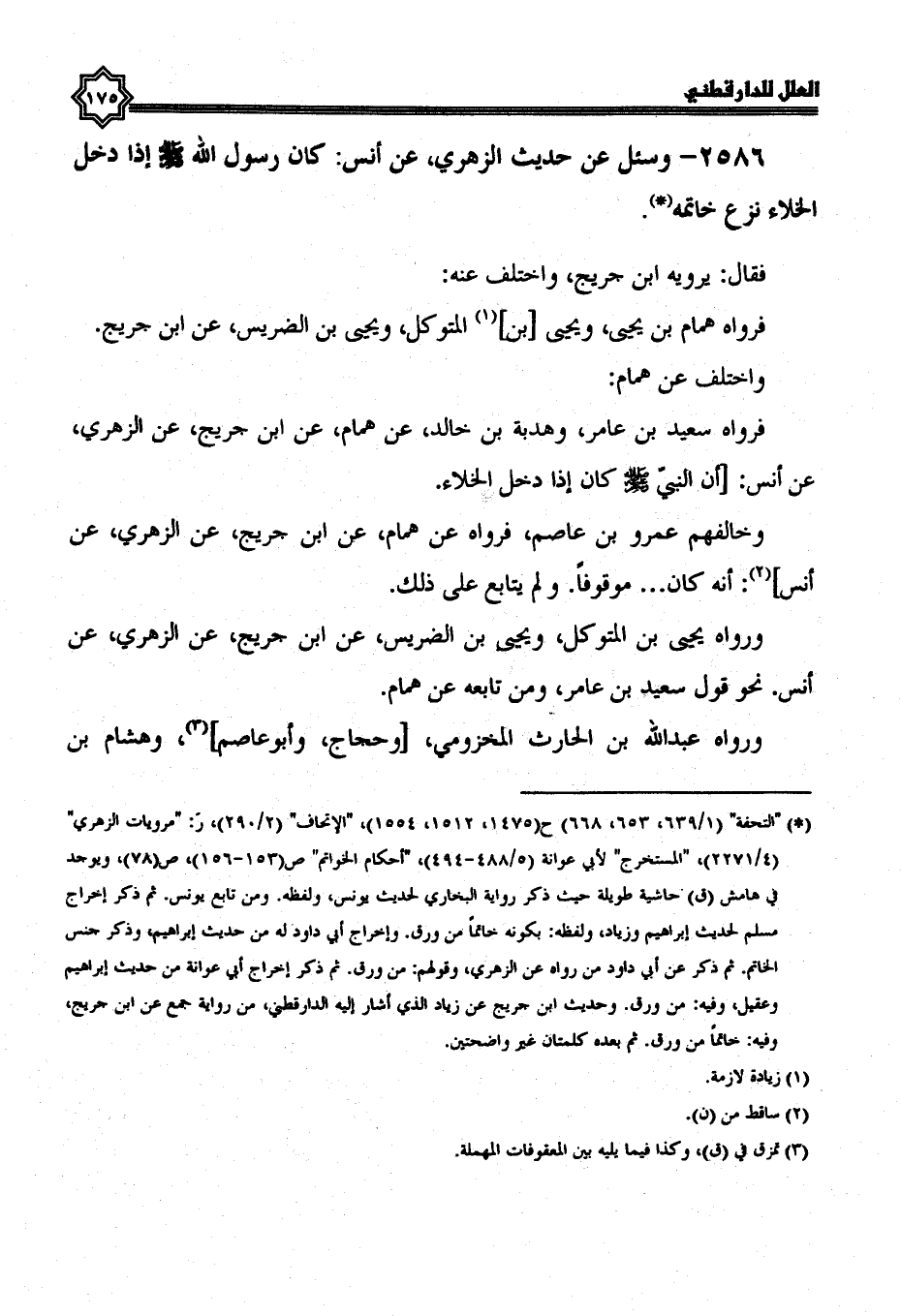 2586- وسئل عن حديث الزهري، عن أنس كَانَ رَسُولُ اللَّهِ صَلَّى اللَّهُ عَلَيْهِ وَسَلَّمَ إذا دخل الخلاء نزع خاتمه.