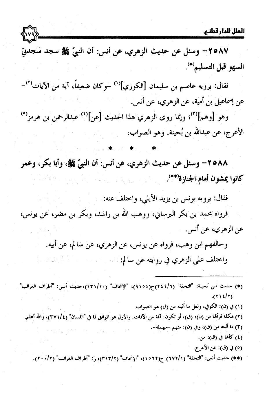 2587- وسئل عن حديث الزهري، عَنْ أَنَسٍ أَنَّ النَّبِيَّ صَلَّى اللَّهُ عَلَيْهِ وَسَلَّمَ سَجَدَ سجدتي السهو قبل التسليم.